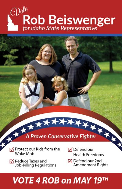 “I never planned on running for elected office. In fact, I moved to Idaho (from Indiana) several years ago simply because I wanted a safe place to raise a family. But after watching the left wing corporate attacks on children’s innocence, parental rights and our freedoms overall, I feel a duty to step up and do my part to protect our freedoms, our state, and our country,” said Beiswenger.